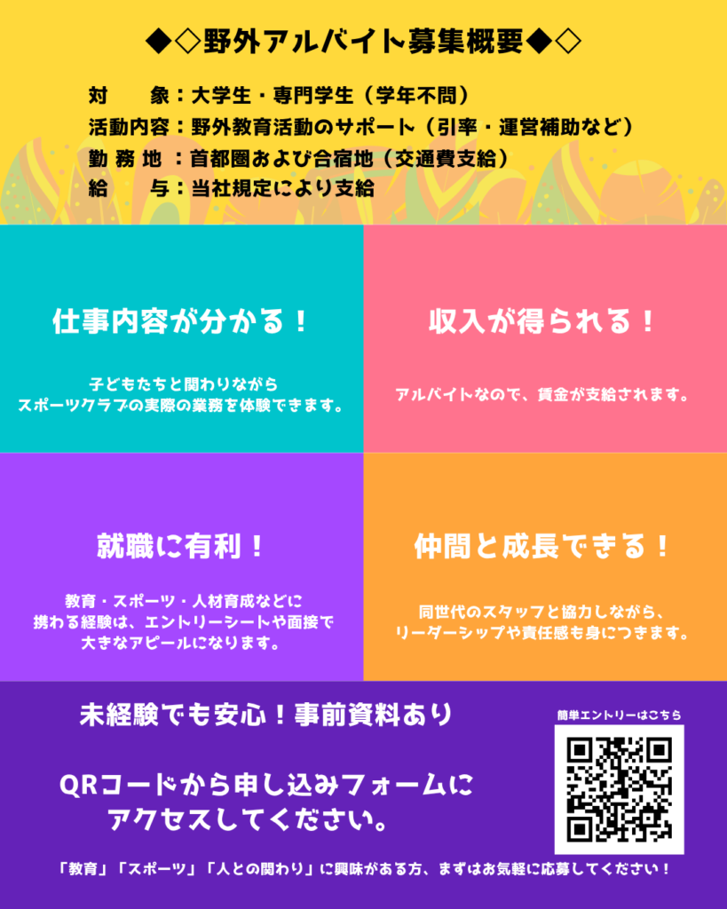 【野外教育活動アルバイト申し込みフォームURL】https://forms.gle/5zG3bVfczETPqsneA